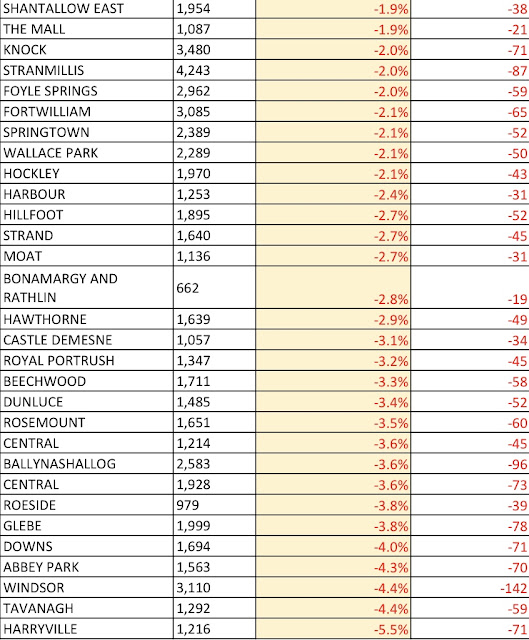 You can see those wards which have grown the most below with Ballymacoss (Lagan Valley) adding the most voters with 1,114 and Farranshane (South Antrim) growing the most proportionally adding 310 new voters but growing by a massive 27.3%! Ballymacoss actually added more voters than the total number of voters in the 29 smallest wards and has become the largest ward in Northern Ireland.
